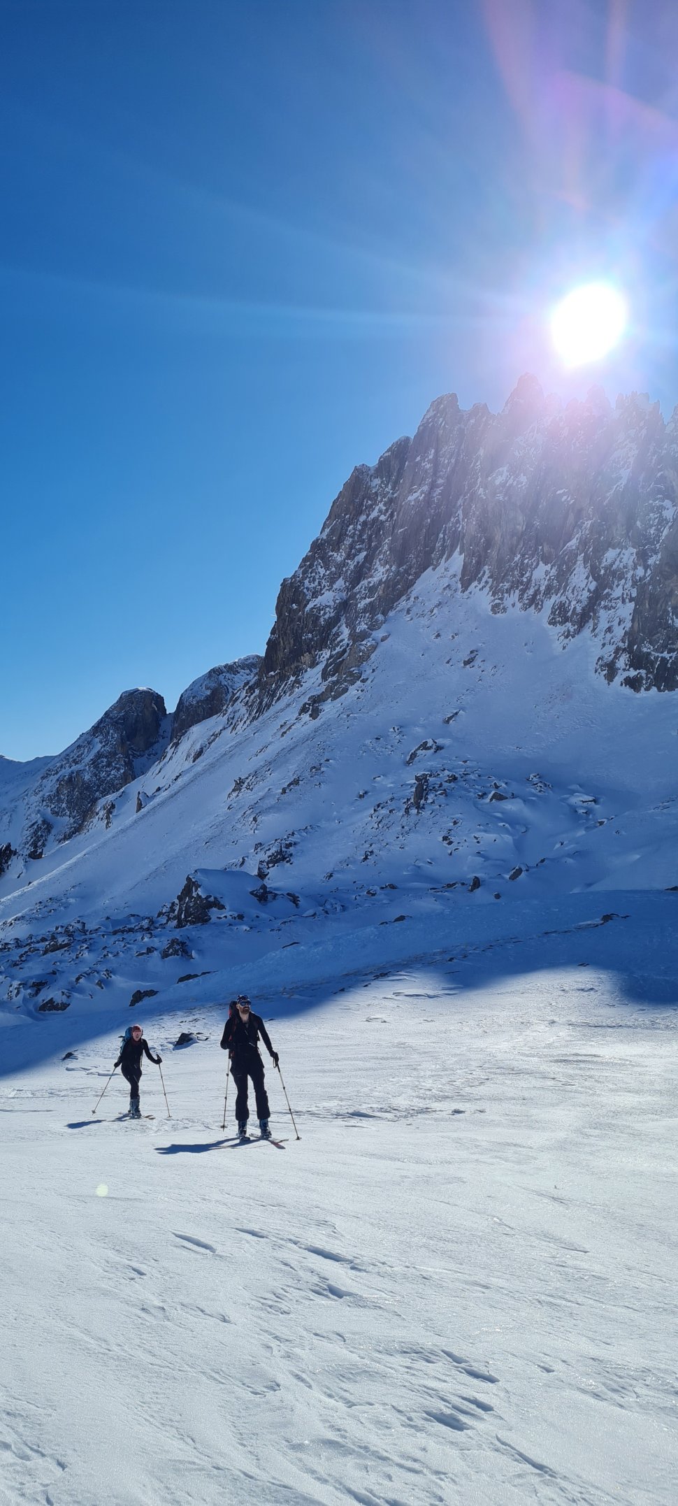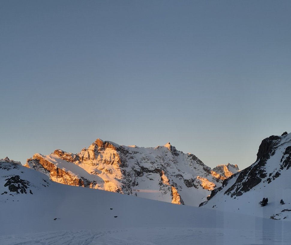 Le deuxième jour, nous quittons le refuge en direction du col des béraudes. Après le passage du col, la descente côté Clarée nous mène à travers de vastes espaces jusqu’au tour de la Moutouse, avant de rejoindre le refuge de Laval. Là encore, l’accueil est à la hauteur : convivial et généreux. La fin d’après-midi se savoure pleinement entre le sauna et quelques roulades revigorantes dans la neige, moment de détente parfait après l’effort.