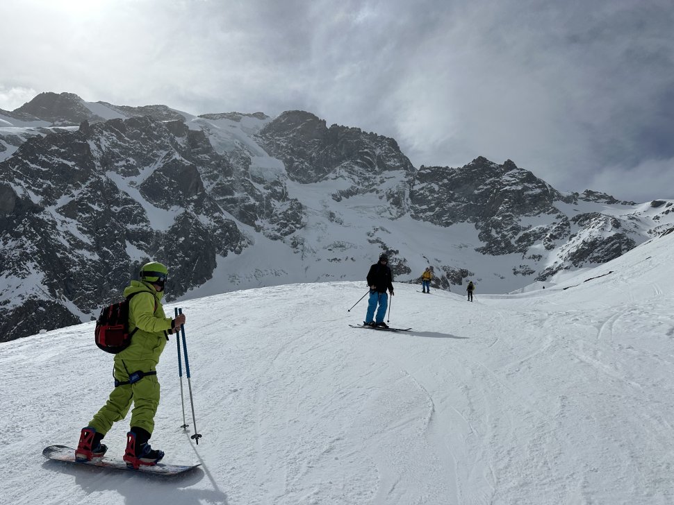 Pour cette première journée, on décide de découvrir les classiques. Depuis le sommet du téléphérique, on bascule dans le mythique Vallon de la Meije. La neige est froide, légèrement travaillée par le vent mais encore douce sous les skis. Les virages s’enchaînent dans cet immense vallon glaciaire entouré de séracs et dominé par la silhouette impressionnante de La Meije.