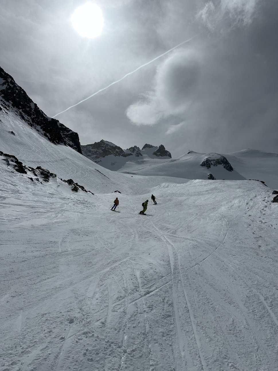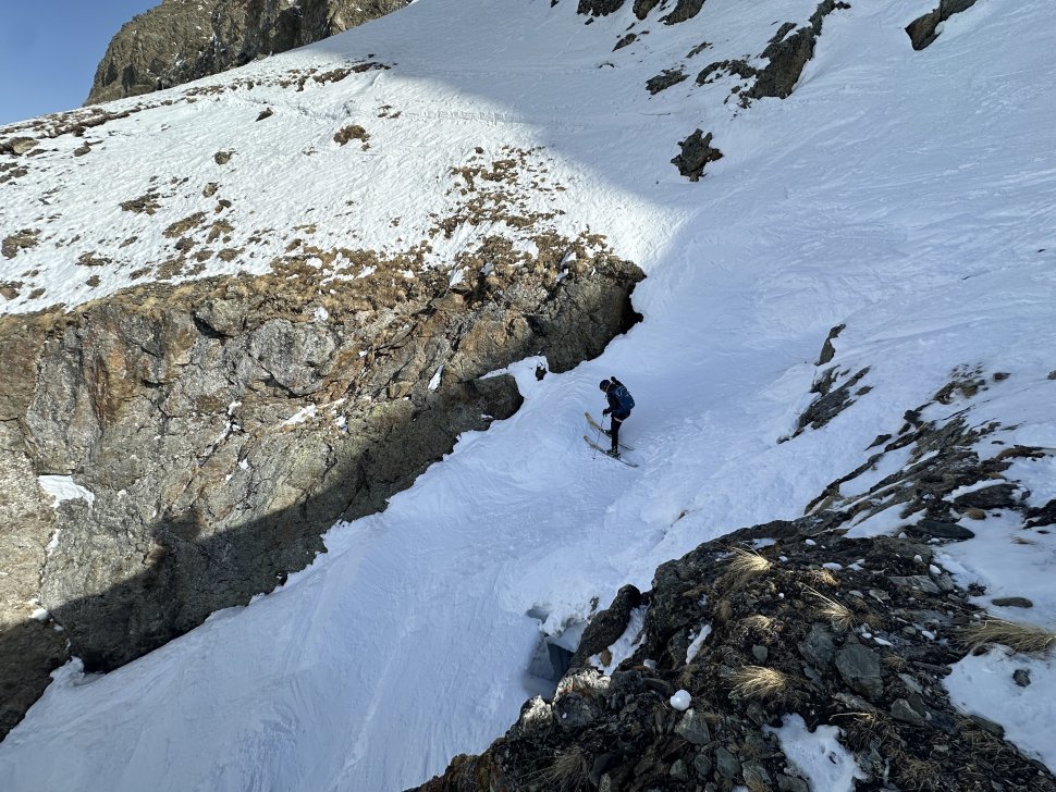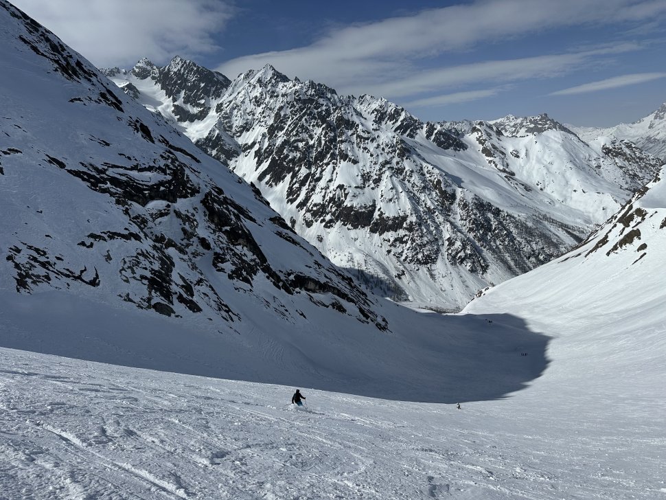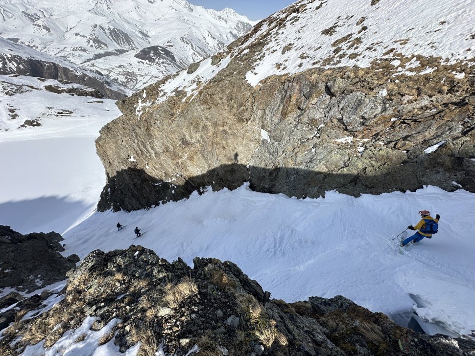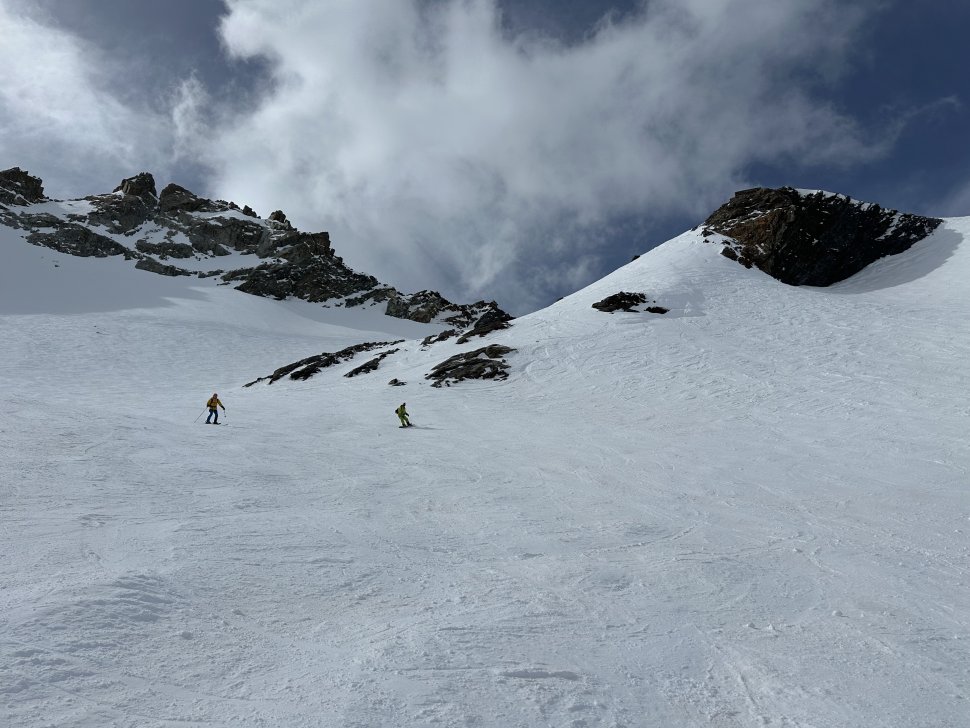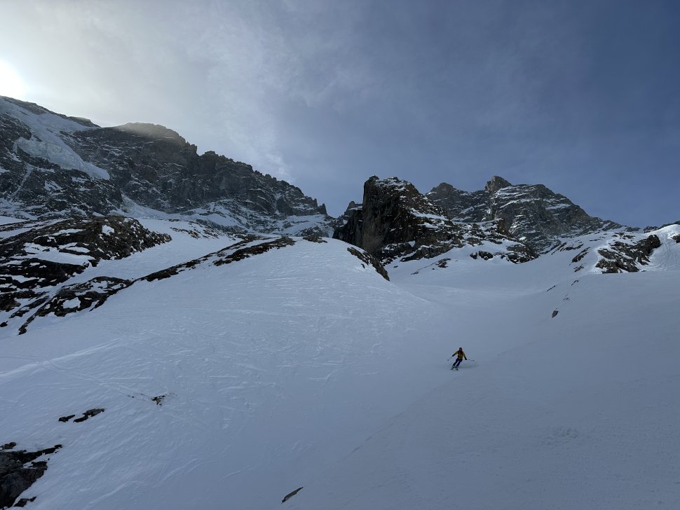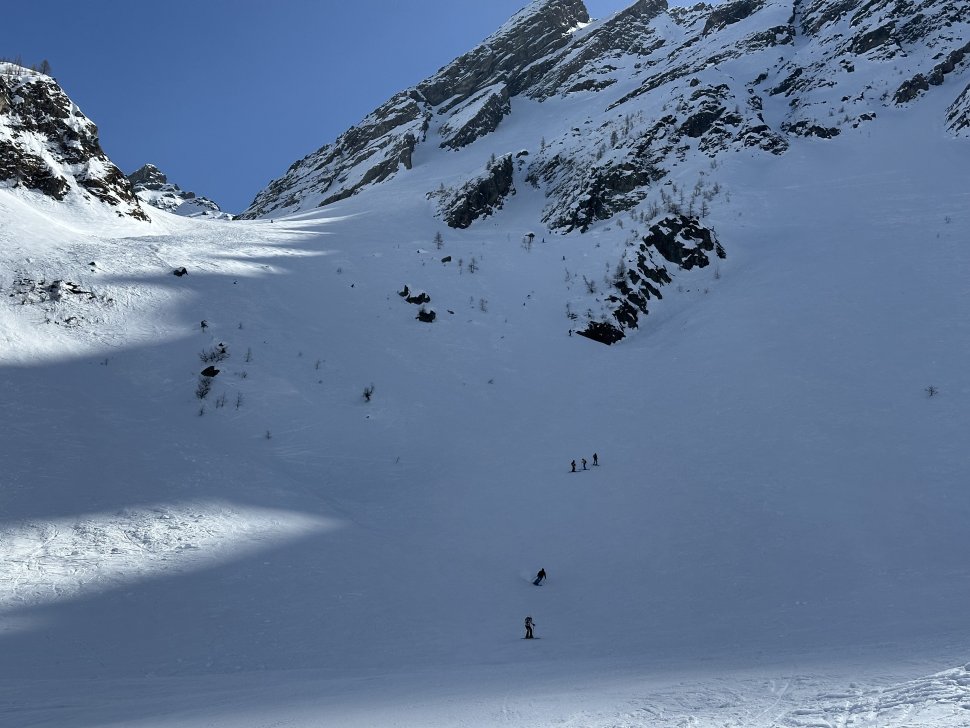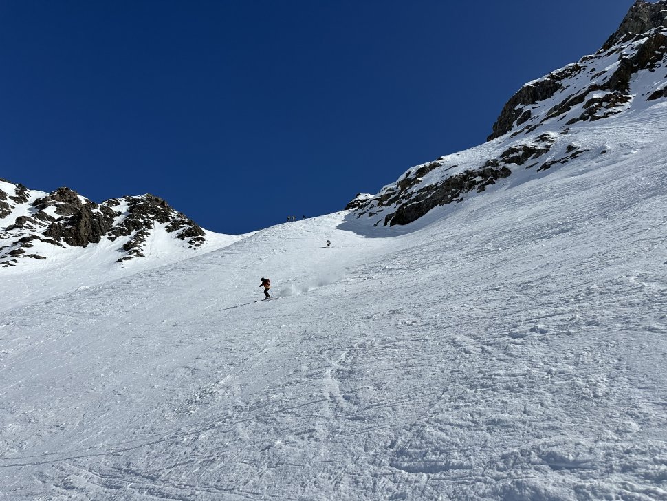 Depuis l’entrée, le couloir plonge droit sous les spatules. La neige est compacte, rassurante. Les premiers virages sont prudents, précis. Puis le rythme vient naturellement : virage sauté, contrôle, respiration, et encore un virage. En bas, on s’arrête tous quelques secondes. Les regards se croisent, mélange d’adrénaline et de sourire silencieux.
