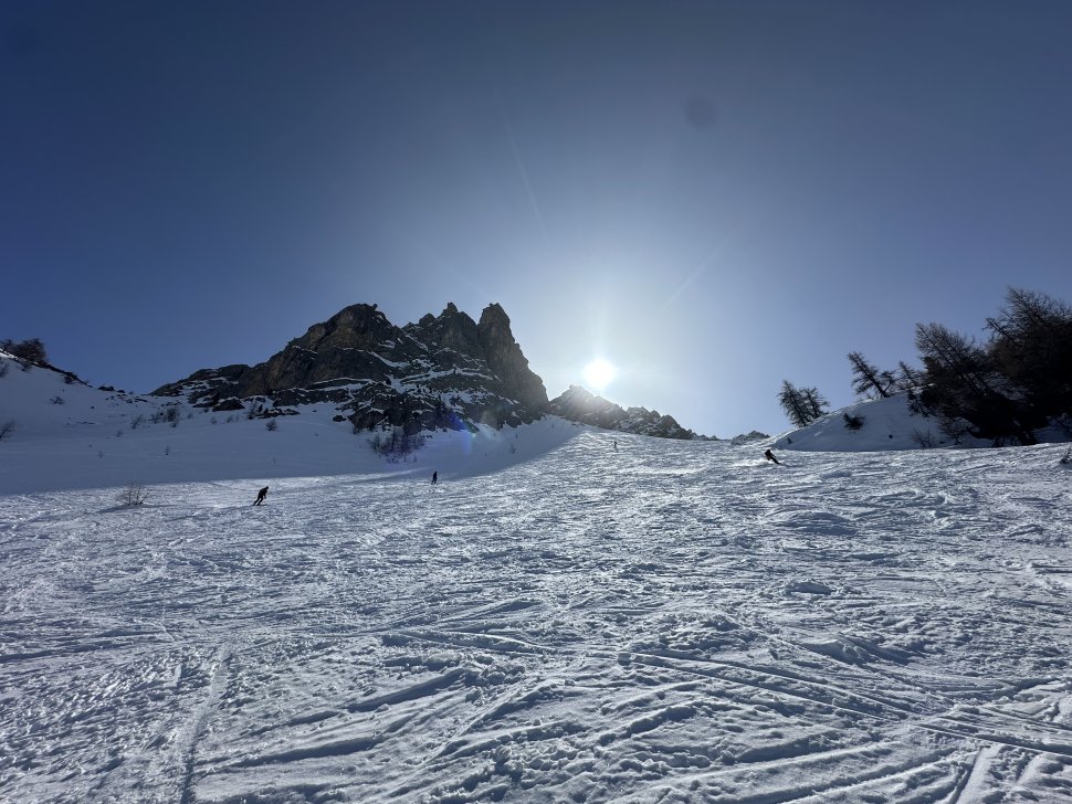 Pour le troisième jour, changement d’ambiance. Direction Le Monêtier-les-Bains dans le domaine de Serre Chevalier. Ici, les remontées sont nombreuses, les forêts plus présentes, mais le hors-piste reste immense.