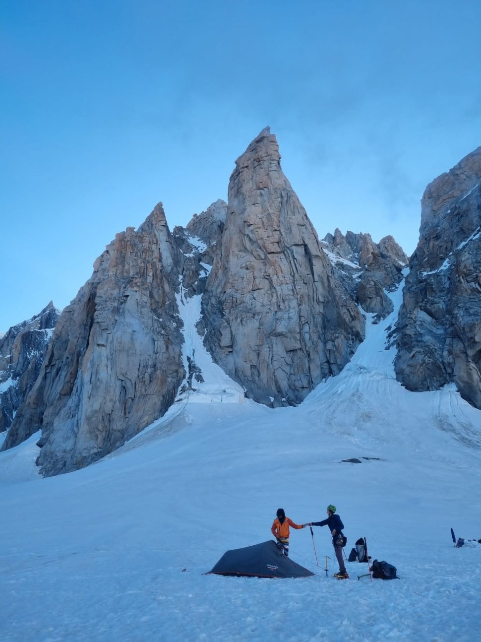 Retour au campement, nous voilà prêt pour repartir le lendemain dans une autre ligne, avec en prime un joli arrière-plan où se dresse la dent du Géant.