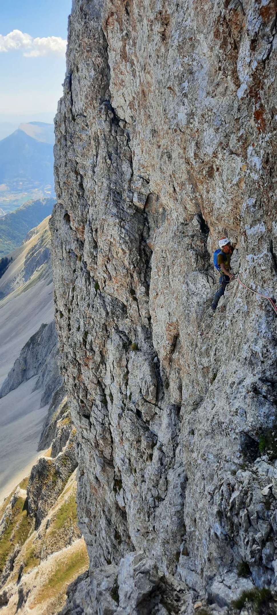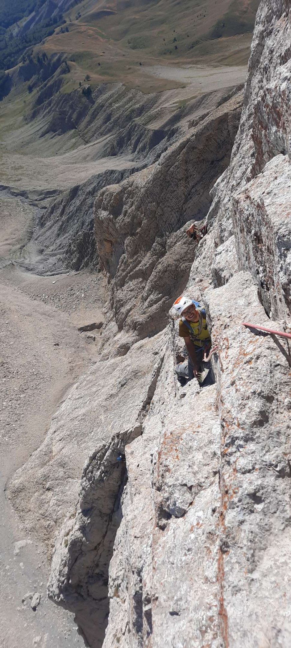 Puis les longueurs s'enchaînent bien, mais plus on monte, plus l'équipement se fait discret et parfois le rocher est bien moyen. Mais quel plaisir d'être là, dans cette face, avec cette ambiance.